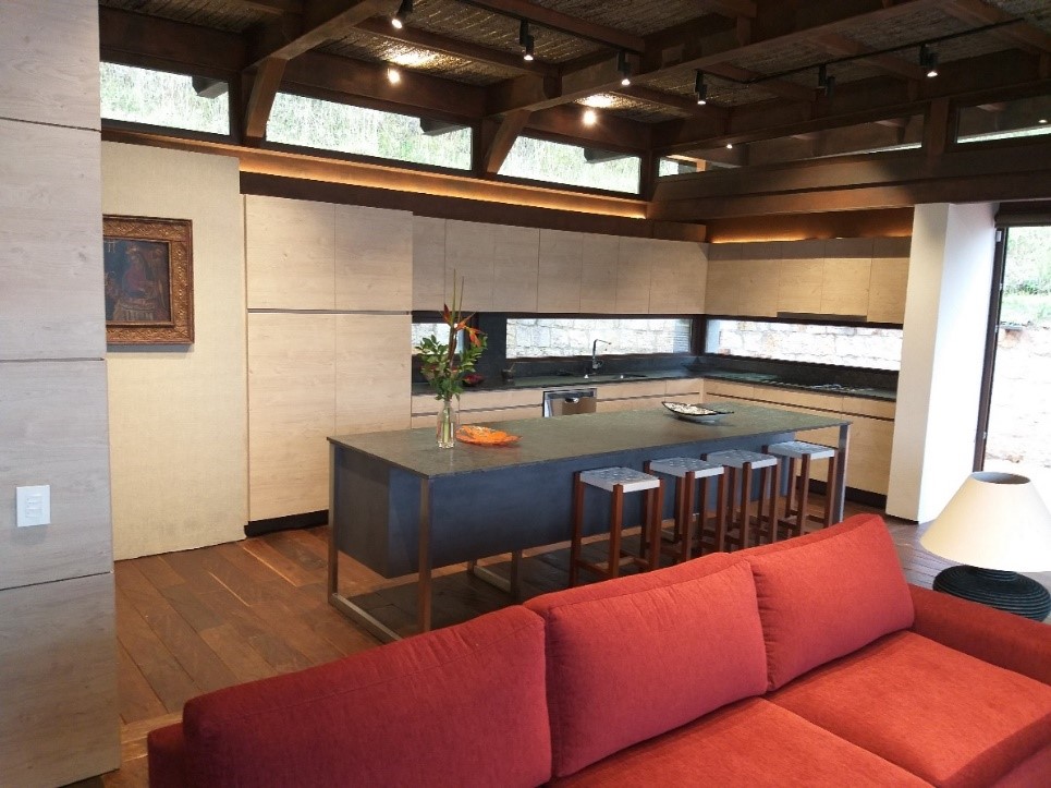 Cocina abierta al comedor donde se integradan en armonia con el amoblamiento de la casa campestre dando un ambiente muy calido y confortable.
