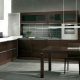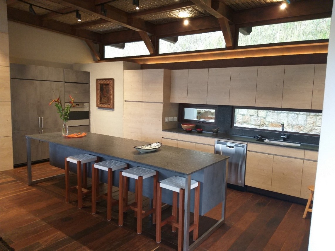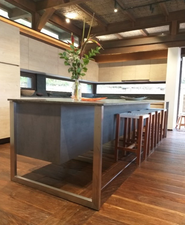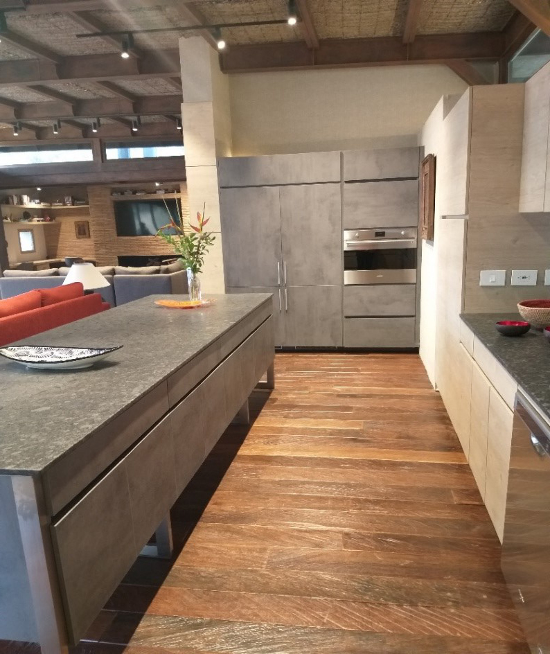 Cocina campestre en acabado laminado concreto sincronizado y tono de madera marcato claro que se mezclan perfectamente con el meson en granito gris con superficie mate corrugada. La barra auxiliar bastante amplia apoyado con paras cuadradas en acero le da un robustocimiento adecuado al tamaño de la cocina.