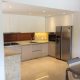 Cocina en poliuretano con meson en quarztone blanco. Se destacan los muros de mamposteria en cemento natural.